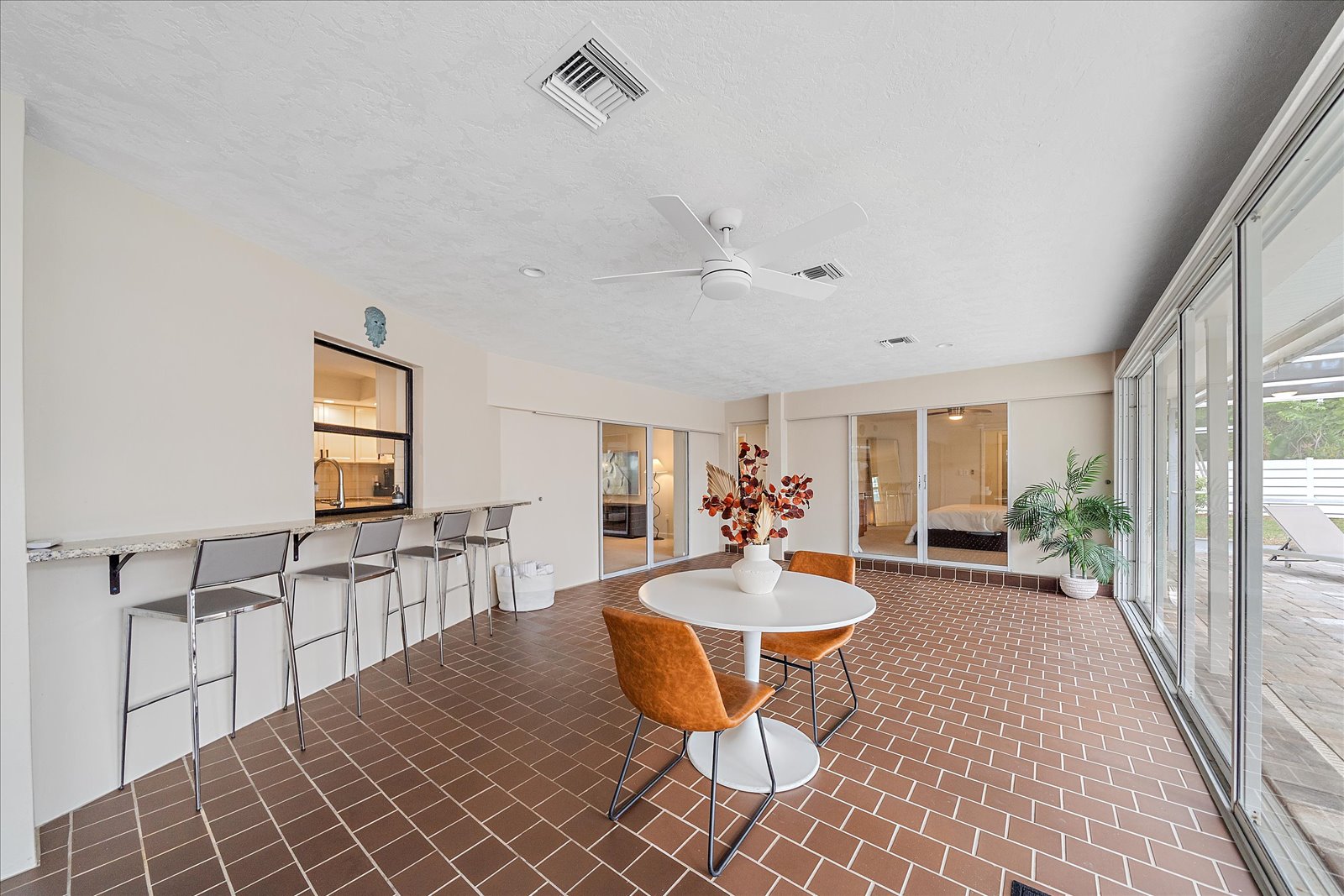 The oversized kitchen serves as the heart of the home and features an island range with overhead hood, pull-out pantry storage, granite countertops, and a sleek black glass Samsung refrigerator with water filtration. A large pass-through window connects the kitchen to the enclosed lanai seating area, making it ideal for casual dining or hosting gatherings.